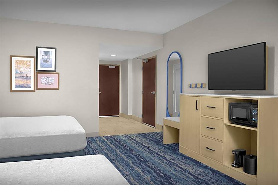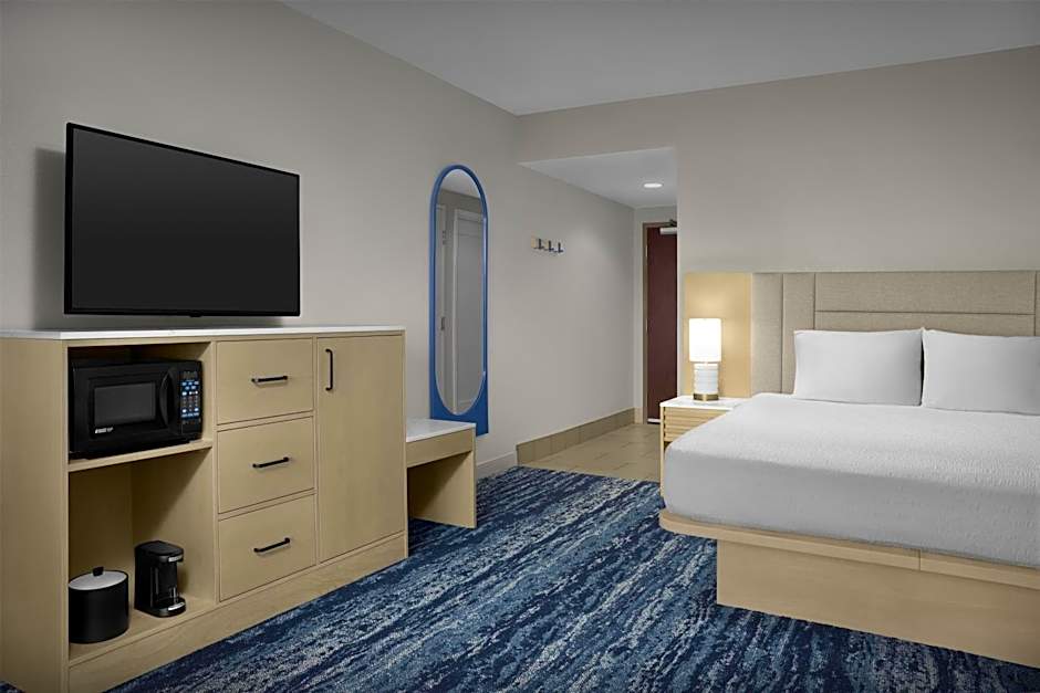This room features a flat-screen TV with cable channels and a work desk. A microwave and refrigerator are also included.